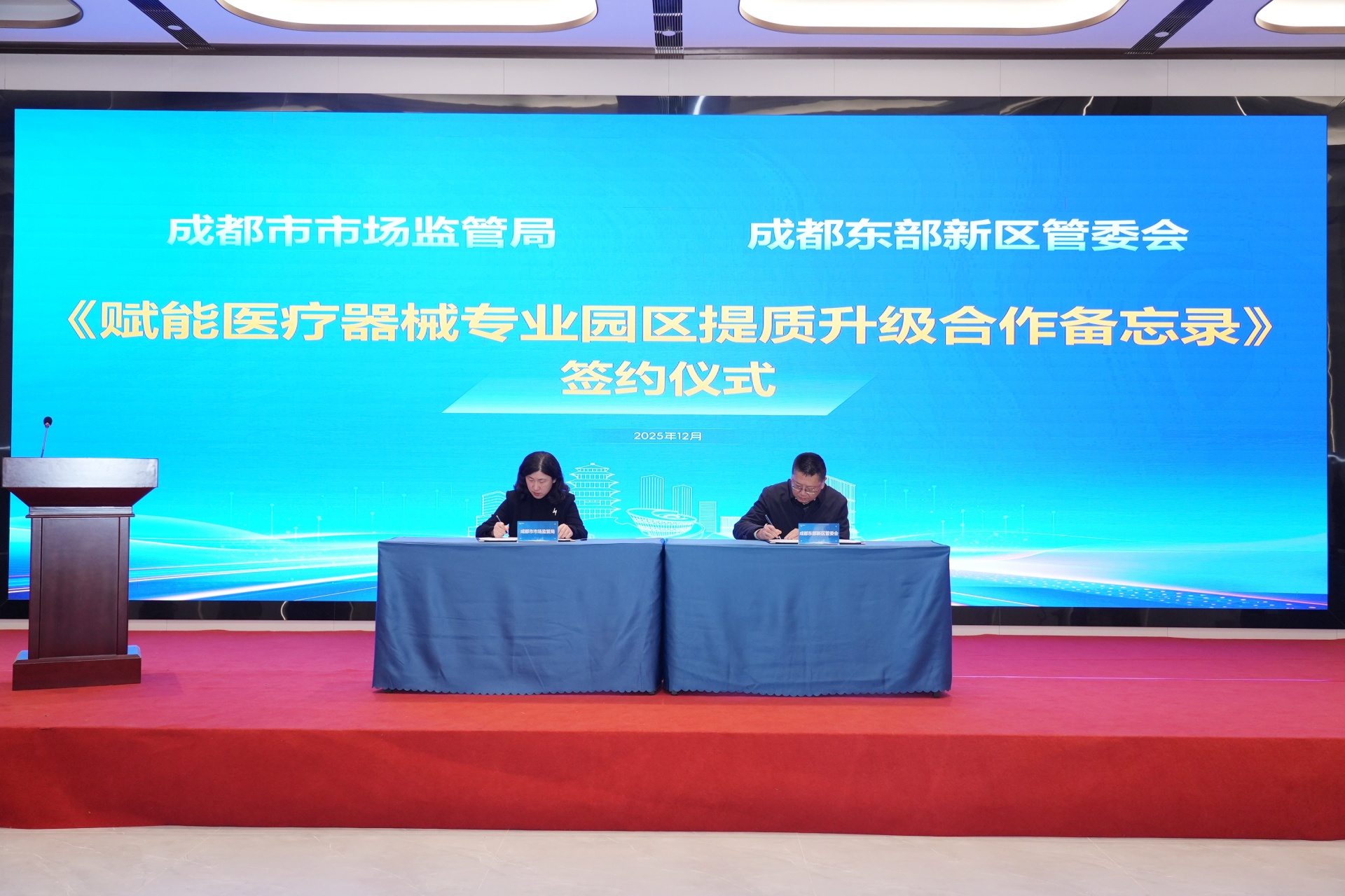 现场,成都市市场监督管理局与成都东部新区管理委员会正式签署战略合作协议,双方聚焦医疗器械专业园区发展痛点,以监管创新为抓手,以政园协同为路径,助力未来医学城打造“全国领先、国际一流”的医疗器械创新高地,为成都生物医药产业高质量发展注入强劲动能。