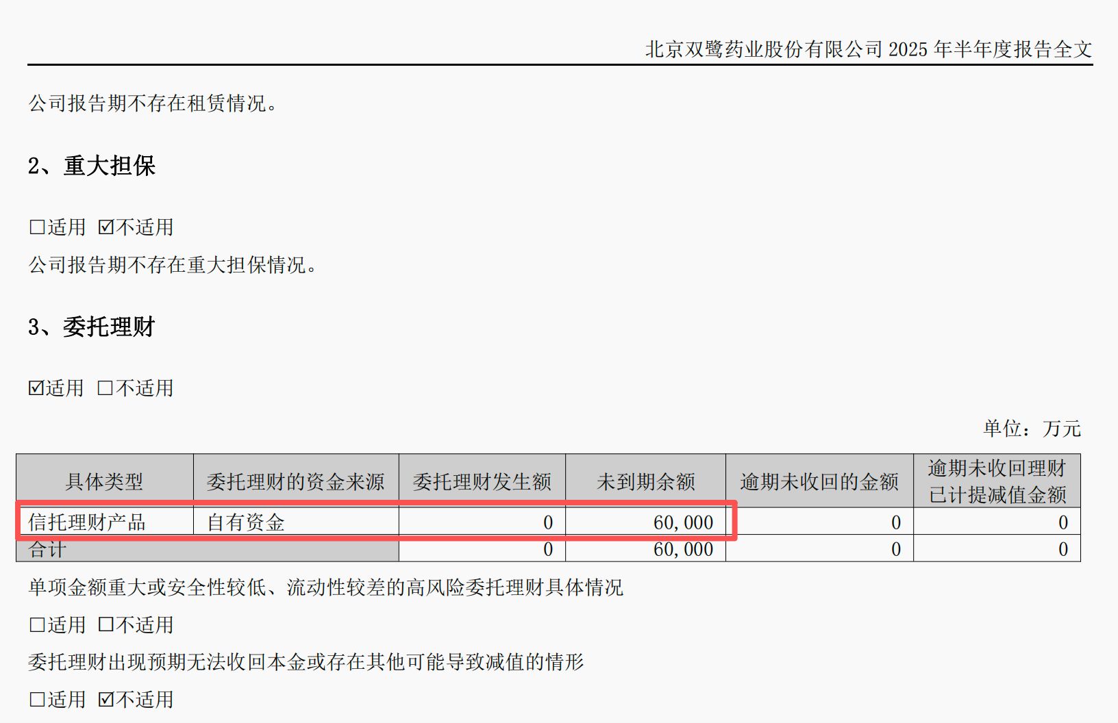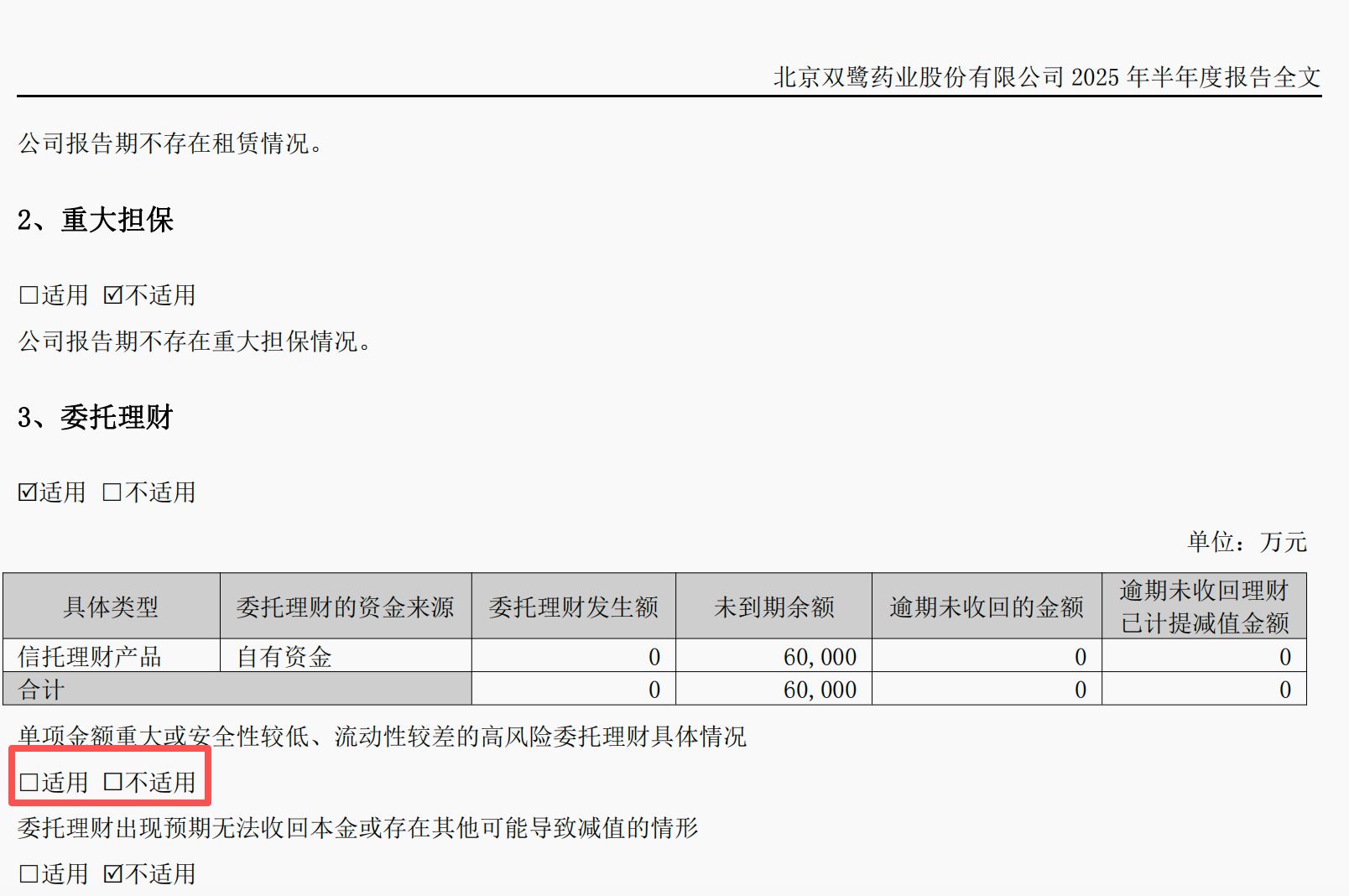 此外,记者还注意到,双鹭药业对于理财产品的安全提示,也存在一定信披瑕疵。比如,公司在2024年年报中,对信托理财产品中下的“单项金额重大或安全性较低、流动性较差的高风险委托理财具体情况”勾选了“不适用”,但在2025年半年报中却未勾选。