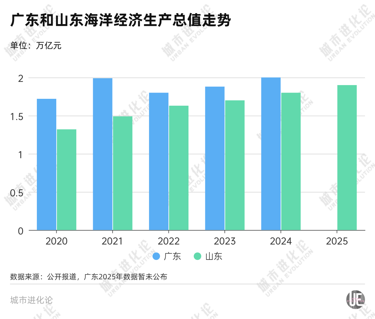 尽管广东2025年数据尚未公布,但从过去几年数据看,山东和广东的海洋生产总值差距明显缩小——2020年,广东、山东海洋生产总值分别为1.72万亿元、1.32万亿元,相差约4000亿元;到2024年,二者海洋生产总值分别增长至2万亿元、1.8万亿元,差距收窄至2000亿元左右。