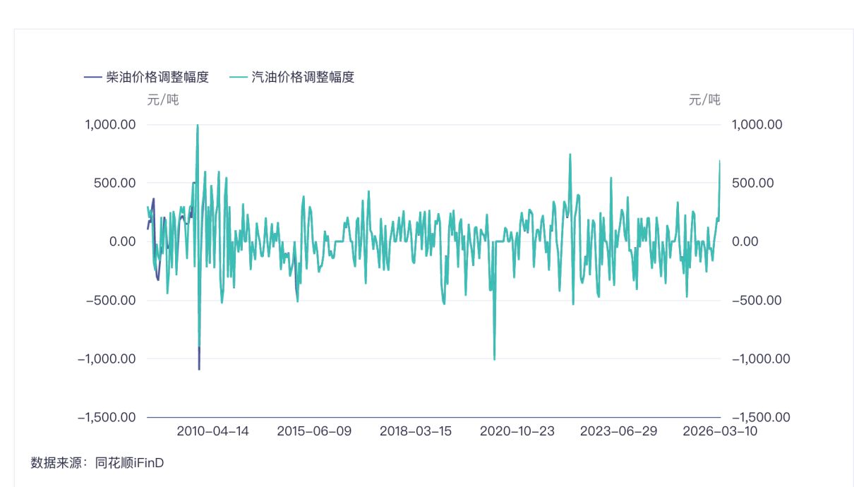 每经记者还发现,除了此次,国内成品油价格历史上曾出现三次调整幅度超千元/吨的情况:2008年6月20日,汽、柴油价格每吨上调1000元;2008年12月19日,汽、柴油供应价格每吨分别下调900元和1100元;2020年3月18日,汽、柴油价格每吨分别降低1015元和975元。